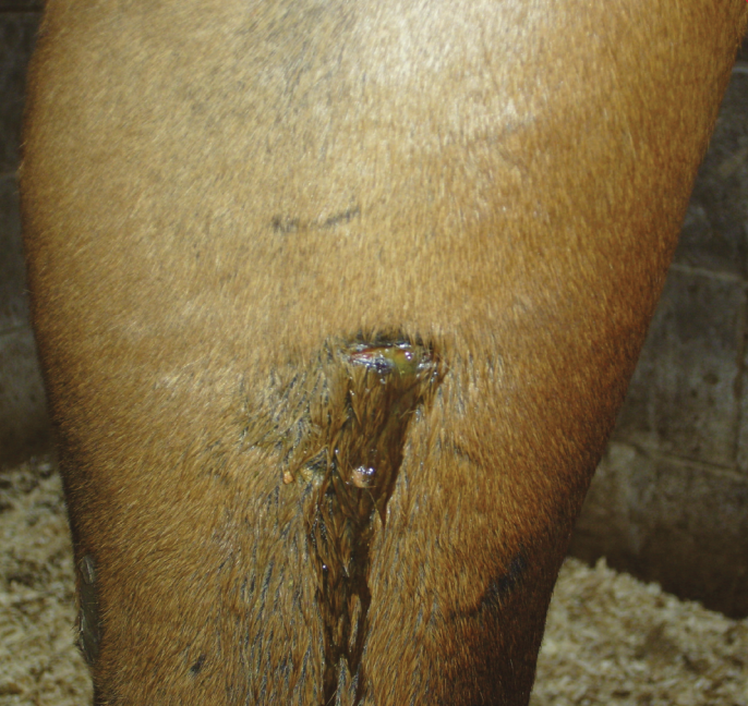 Clinical signs of tetanus are usually seen ten to fourteen days after the bacteria entered the wound. The toxins produced by the bacteria cause the horse’s muscles to continually contract. Initially the horse will appear to be slightly stiff, but it will get more severely affected and less able to move. Horses with tetanus also appear anxious and are extremely sensitive to stimuli such as being touched or sounds. Ultimately the horse has trouble eating, standing and breathing and will die from respiratory failure.